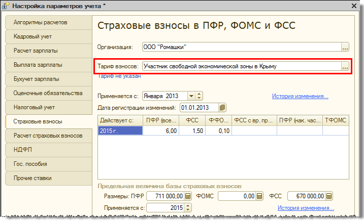 Вместе с тем, с 2015 года Федеральным законом от 29 ноября 2014 года № 378-ФЗ предусмотрен новый пониженный тариф страховых взносов. Он добавлен в версию 2.5.87 под названием «Участник свободной экономической зоны в Крыму».