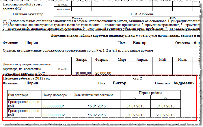 В шапку карточки добавлена строка описания договорных отношений. Если с человек заключены договоры разных типов, отмечаются одновременно несколько флажком. При наличии несколько договоров выводится дополнительная страница «Периоды работы за ... год».