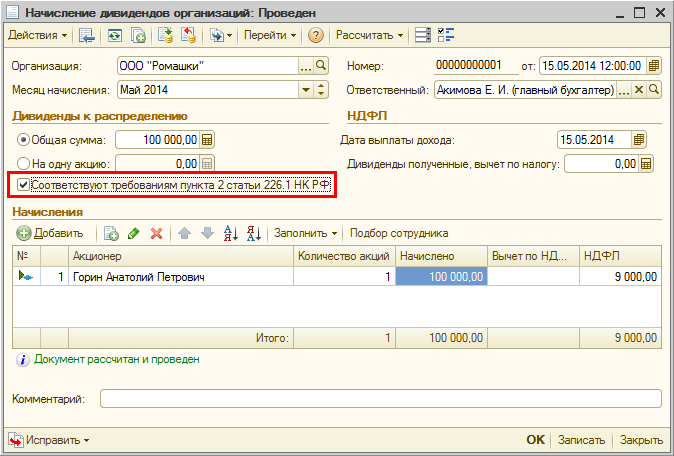 Для поддержки положений этого письма в версии 2.5.89.1 реализовано следующее. В документе «Начисление дивидендов» добавлен флажок «Соответствуют требованиям пункта 2 статьи 226.1 НК РФ».