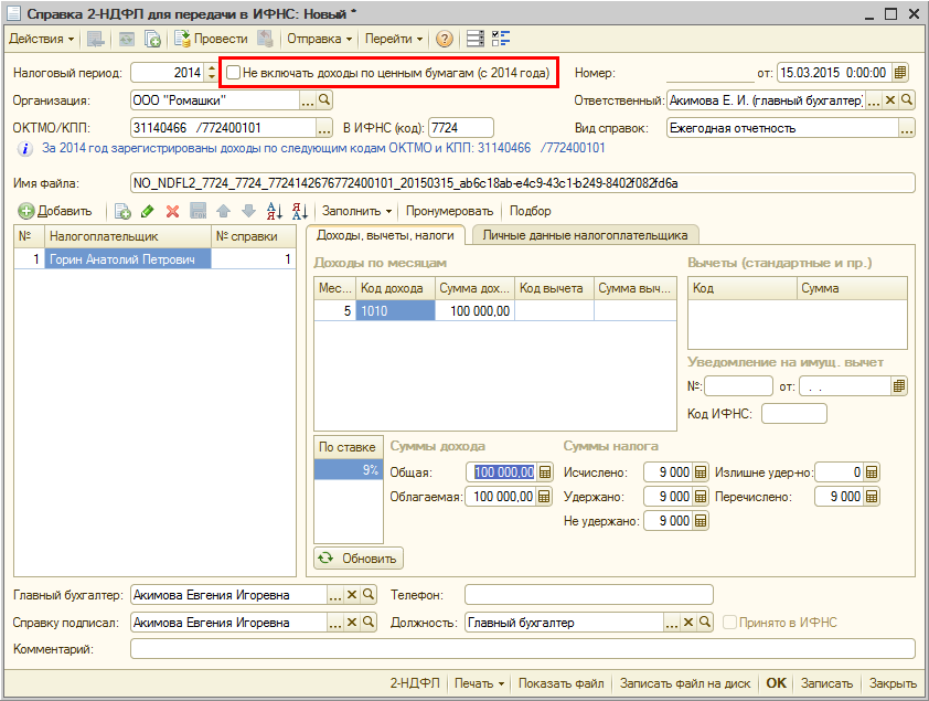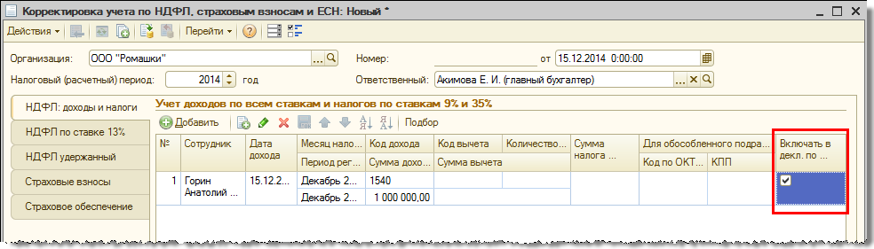 Возможность управления включением доходов в 2-НДФЛ как на уровне их регистрации документами, так и на уровне заполнения справки связана с тем, что декларация по налогу на прибыль за 2014 год может быть подана как по новым правилам (с отражением таких доходов), так и по старым (без их отражения).