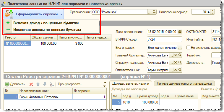 Аналогичная возможность реализована в рабочем месте подготовки данных по НДФЛ. Справки можно сформировать как включая доходы по ценным бумагам, так и исключая их.
