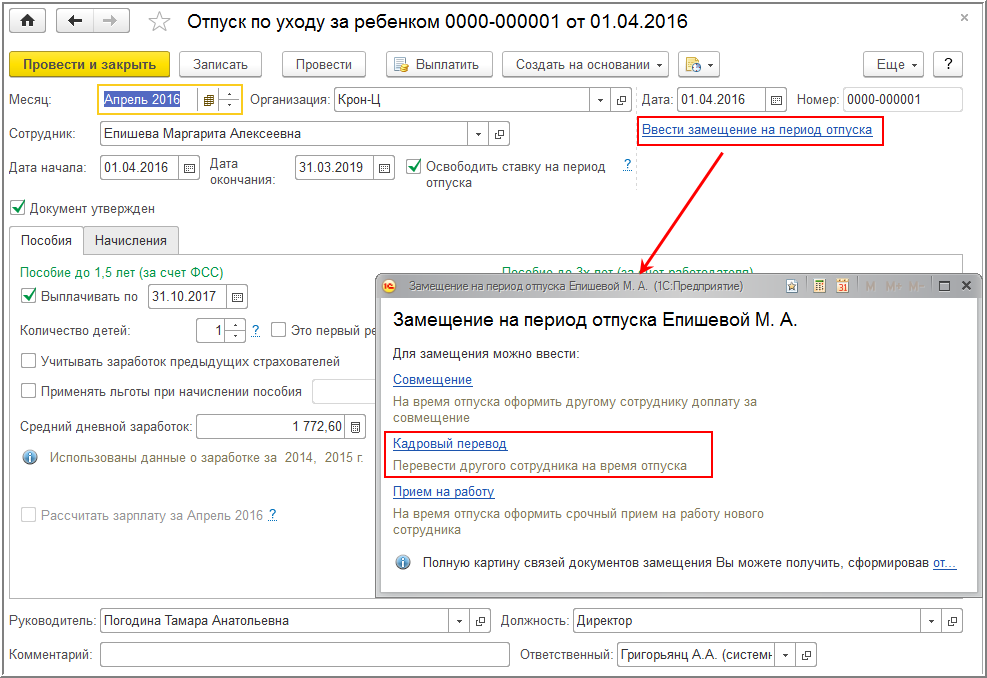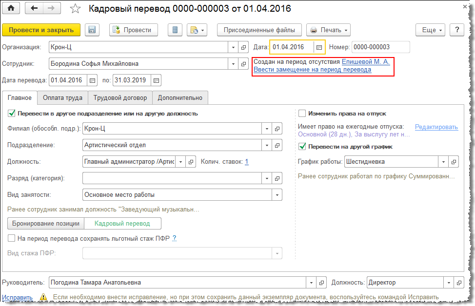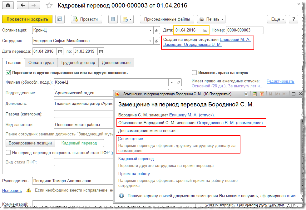 Сотрудник Епишева М.А. уходит в отпуск по уходу за ребенком. В это время ее будет замещать сотрудник Бородина С.М., для чего на основании отпуска можно ввести кадровый перевод.