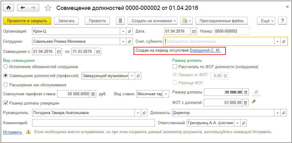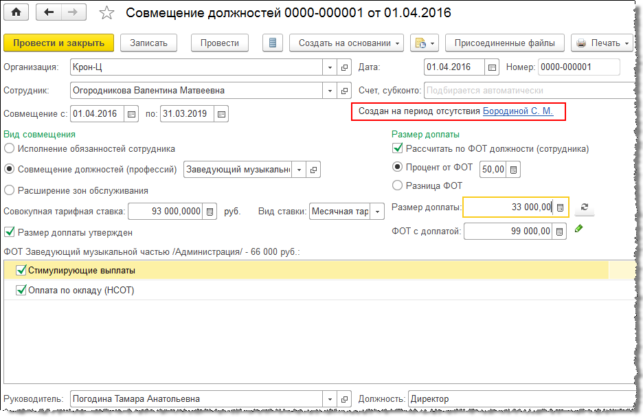 Так как позиция Бородиной С.М. временно освободилась, эти обязанности делят между собой два сотрудника. Для этого на основании кадрового перевода можно оформить документы «Совмещение должностей»: