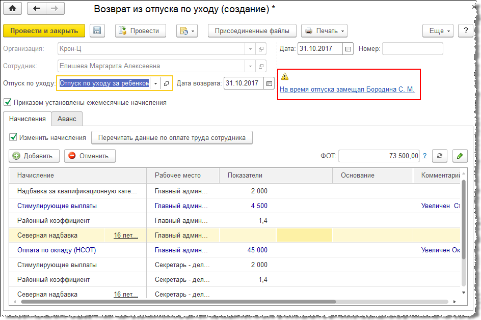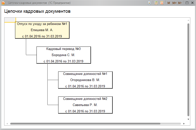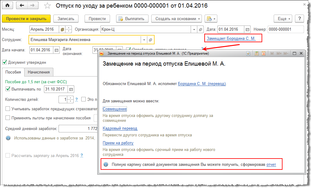 При исправлении связанных документов, а также при создании, например, возврата из отпуска по уходу за ребенком, в этих документах будет отображаться информация о связях.