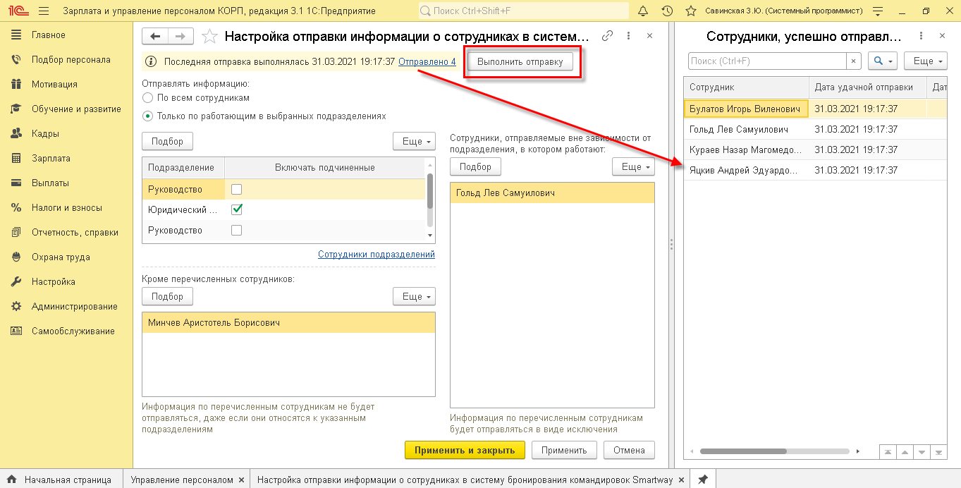 Администратор перечисляет, данные каких сотрудников этих подразделений не нужно отправлять в сервис. И наоборот указывает, данные каких сотрудников должны выгружаться в сервис независимо от их подразделения. После применения правил, выгрузка будет выполняться автоматически в соответствии с установленным отбором подразделений и сотрудников.