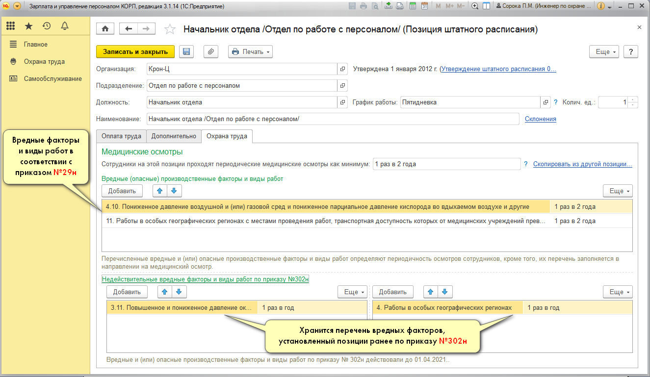 Справочник Штатное расписание теперь отражает вредные факторы и виды работ на позиции в соответствии с Приказом №29н. Если ранее для позиции были указаны вредные факторы и виды работ в соответствии с Приказом №302н, эта информация сохранена в группе Недействительные вредные факторы и виды работ по Приказу №302н