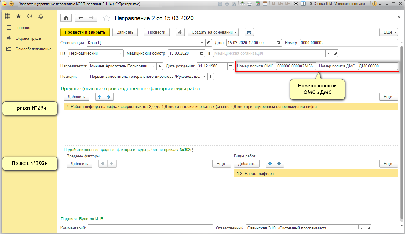 В направлении на медосмотр отражены вредные факторы и виды работ в соответствии с Приказом №29н и №302н (если они ранее были указаны для рабочего места). В направлении появились поля для ввода номеров полисов ОМС и ДМС