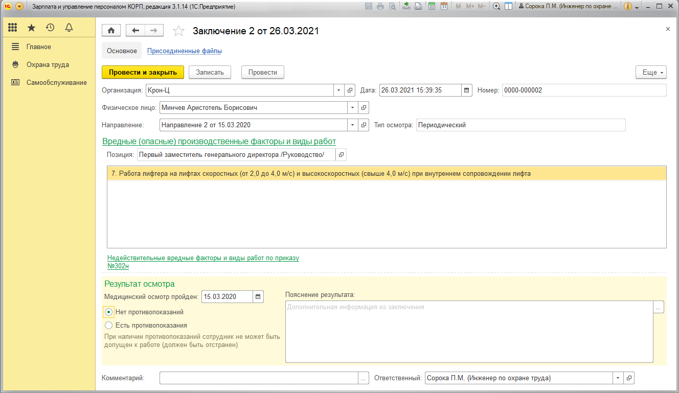 В заключении медицинского осмотра отражаются вредные факторы и виды работ по Приказу №29н и №302н (если они ранее были указаны для рабочего места)