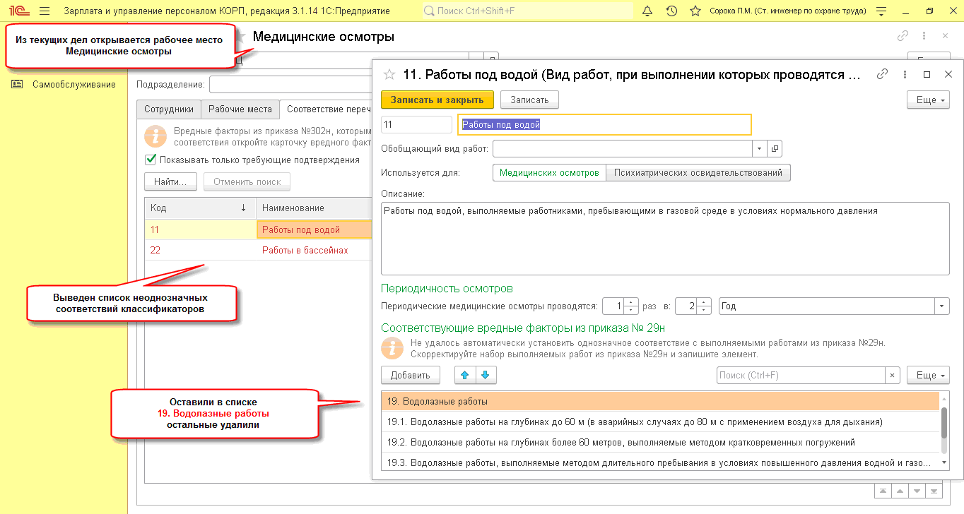 Из текущих дел Старший специалист по охране труда открывает рабочее место Медицинские осмотры, где на закладке Соответствие перечня №302н перечню №29н отразится список видов работ по Приказу №302н, которым автоматически не было найдено однозначное соответствие в перечне по Приказу №29н. Требуется уточнение.