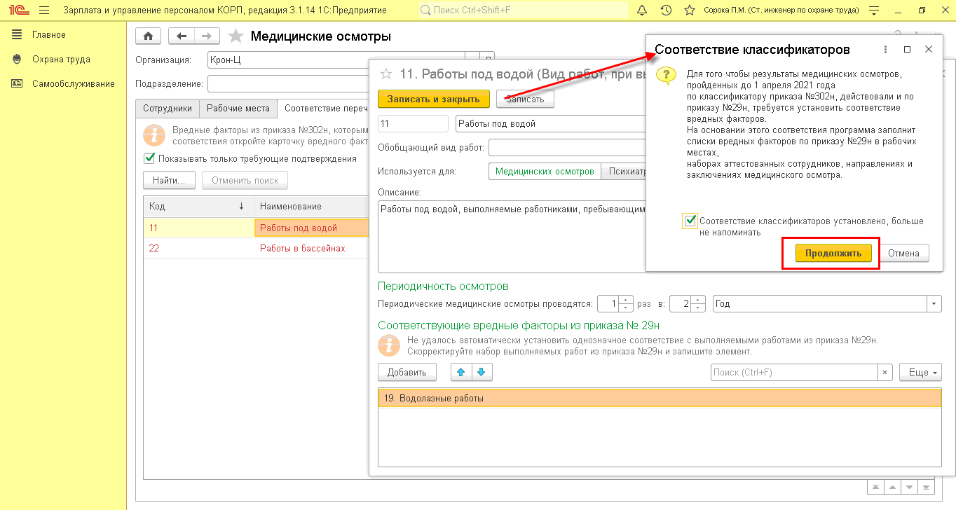 В некоторых случаях после обновления Старший специалист по охране труда может увидеть в списке текущих дел напоминание: Соответствие вредных факторов. Это значит, что необходимо установить соответствие между классификаторами по Приказу №302н и №29н
