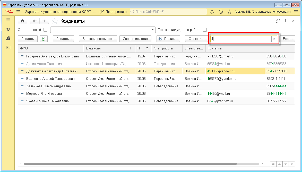 В списке кандидатов добавлена группа «Контакты», отражающая адрес электронной почты и телефон кандидата. Менеджер по персоналу находит кандидатов контекстным поиском не только по части ФИО, но и по контактной информации.