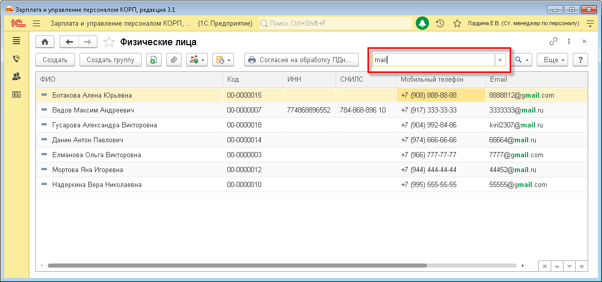 Контактная информация также отражается в списке физических лиц с возможностью контекстного поиска.