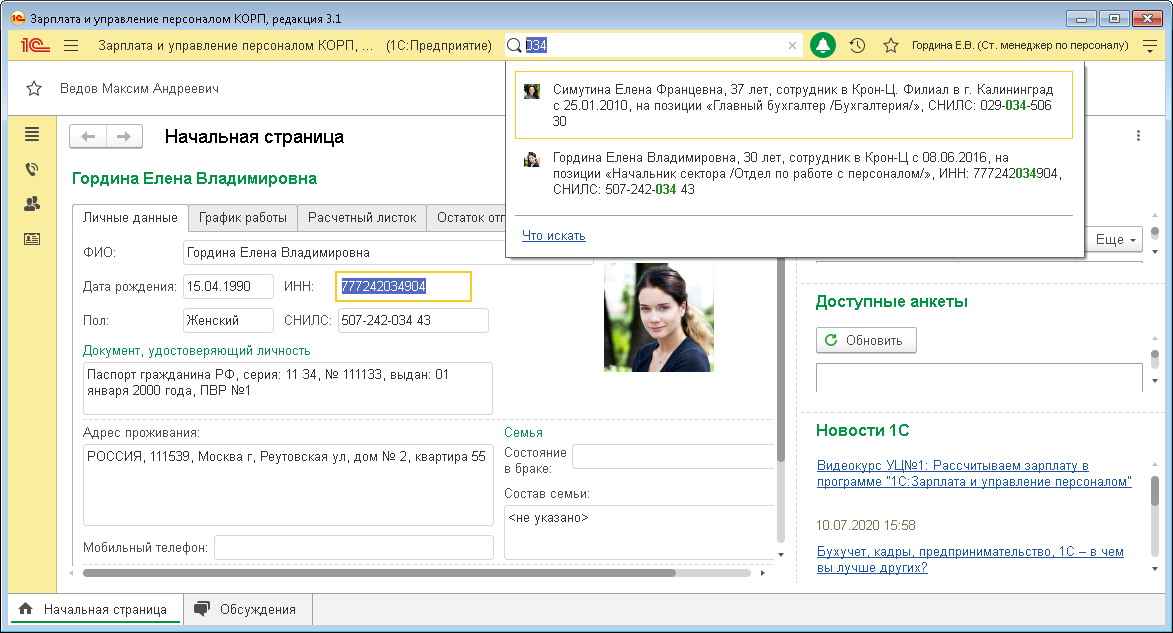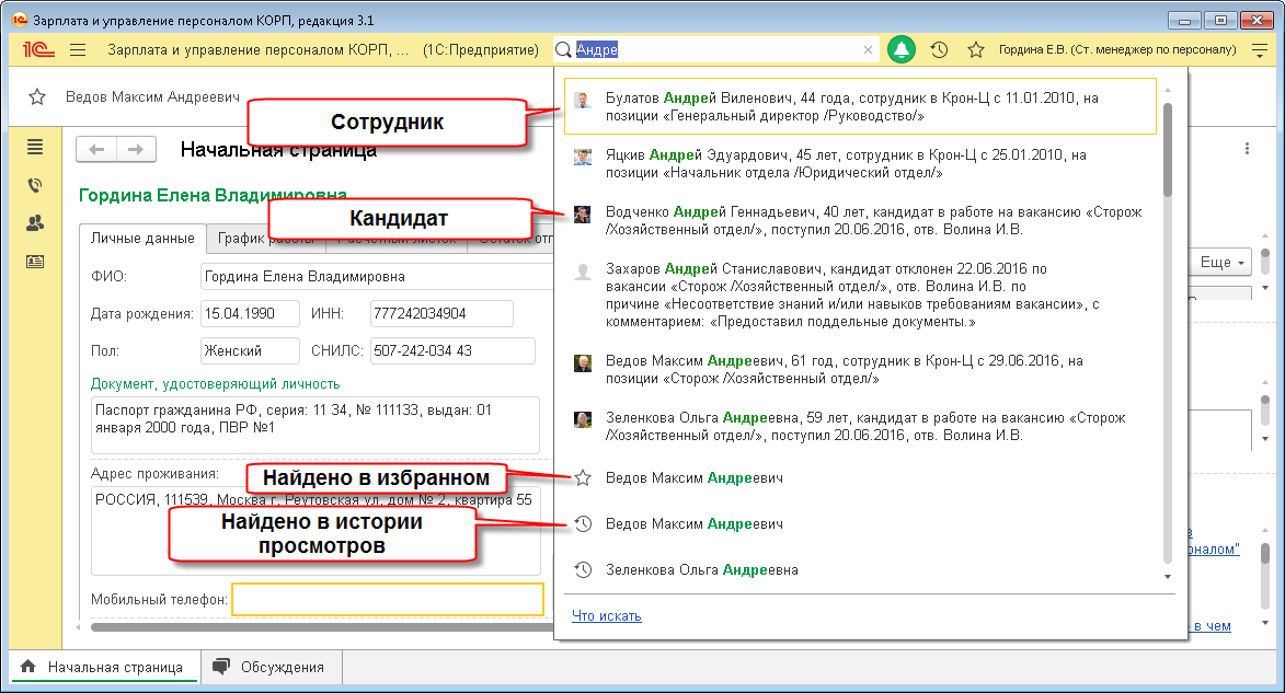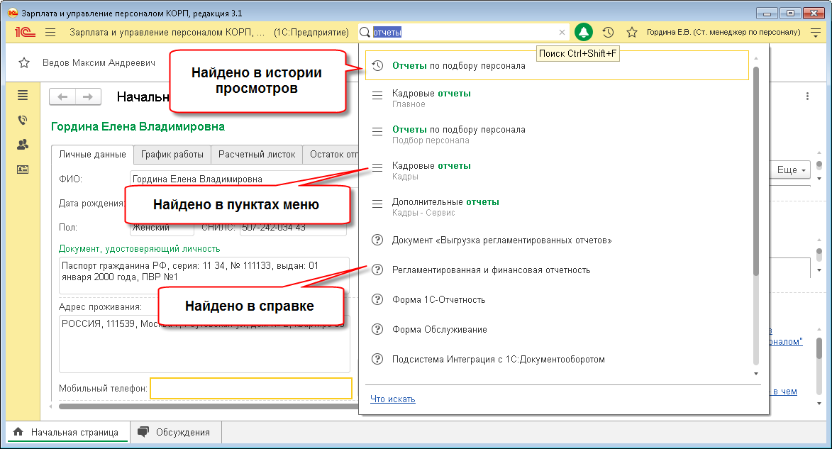 В 1С:ЗУП КОРП, работающем с версией 1С:Предприятия 8.3.15 и выше, появилась возможность глобального поиска среди: