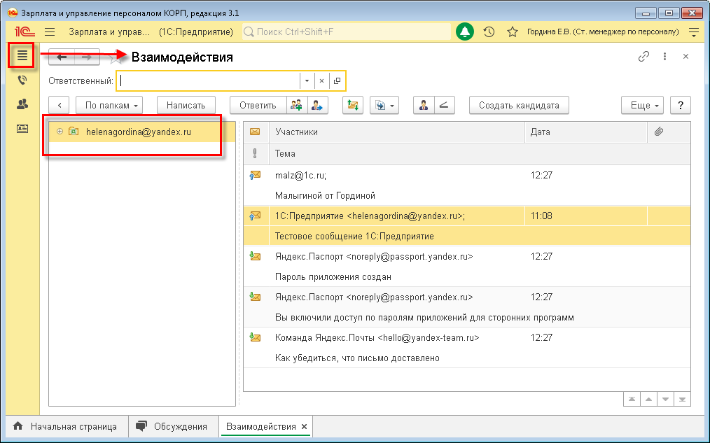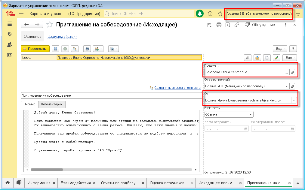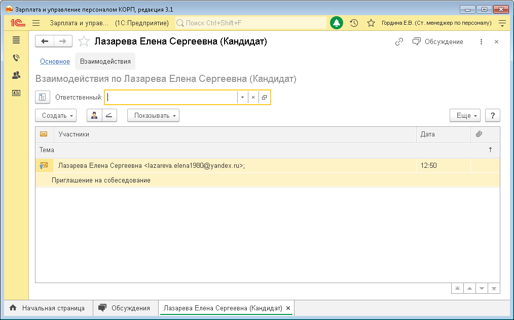 Письма, предмет которых – кандидат, участники подбора видят в 1С:ЗУП КОРП в карточке этого кандидата в разделе «Взаимодействия».