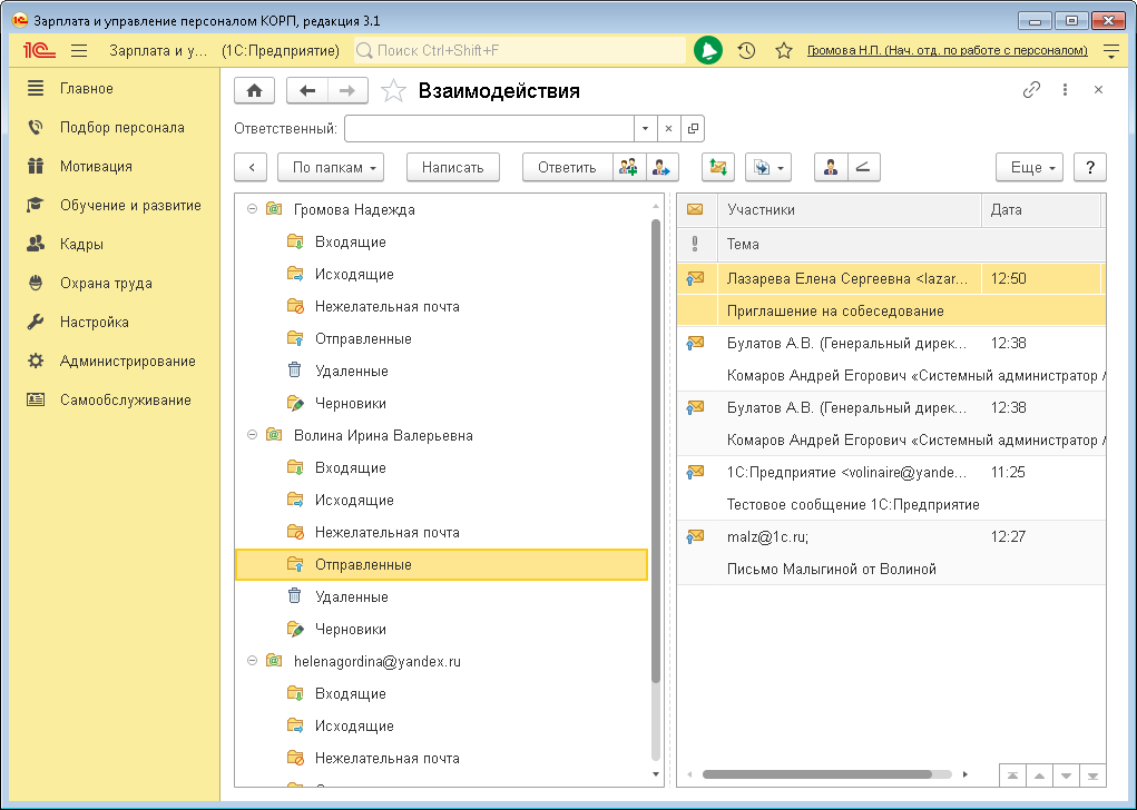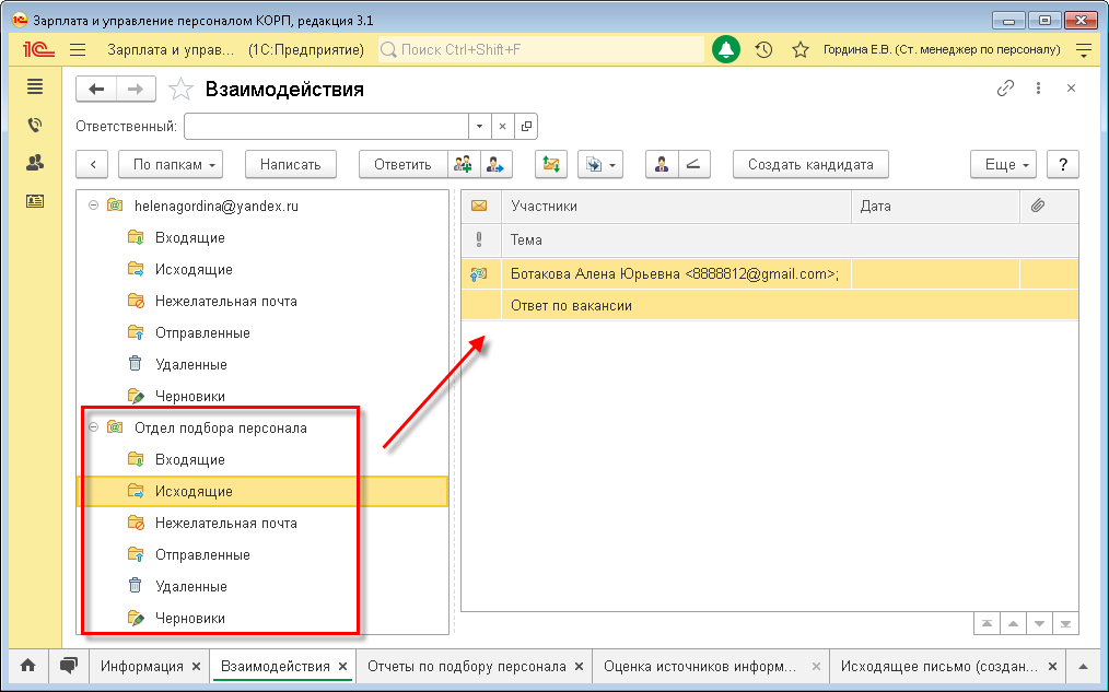 Если старший менеджер в 1С:ЗУП КОРП со своего персонального почтового ящика отправил письмо кандидату или направил его резюме руководителю на рассмотрение, только эти сообщения станут доступны всем участникам подбора, а остальная переписка с этого ящика будет скрыта.