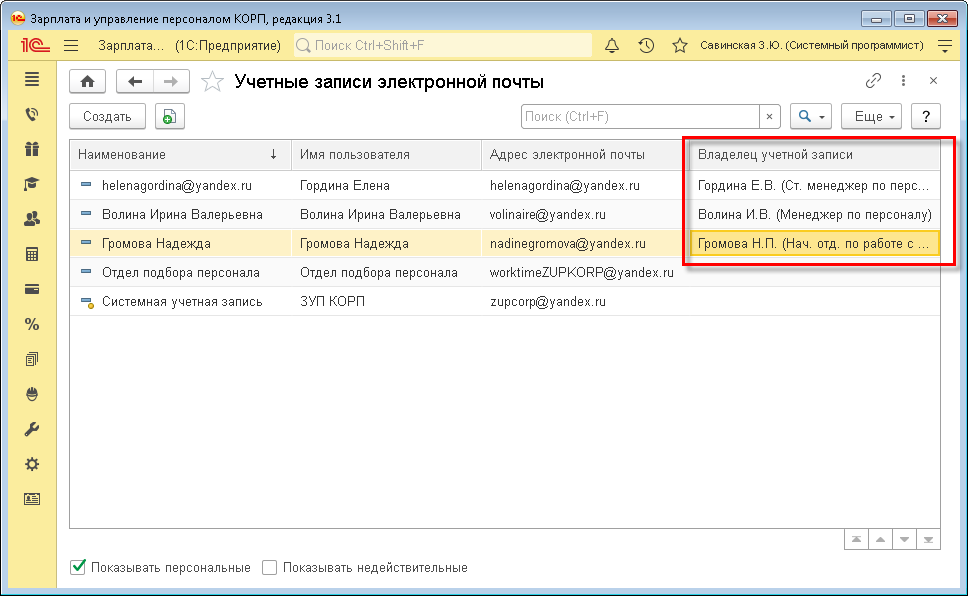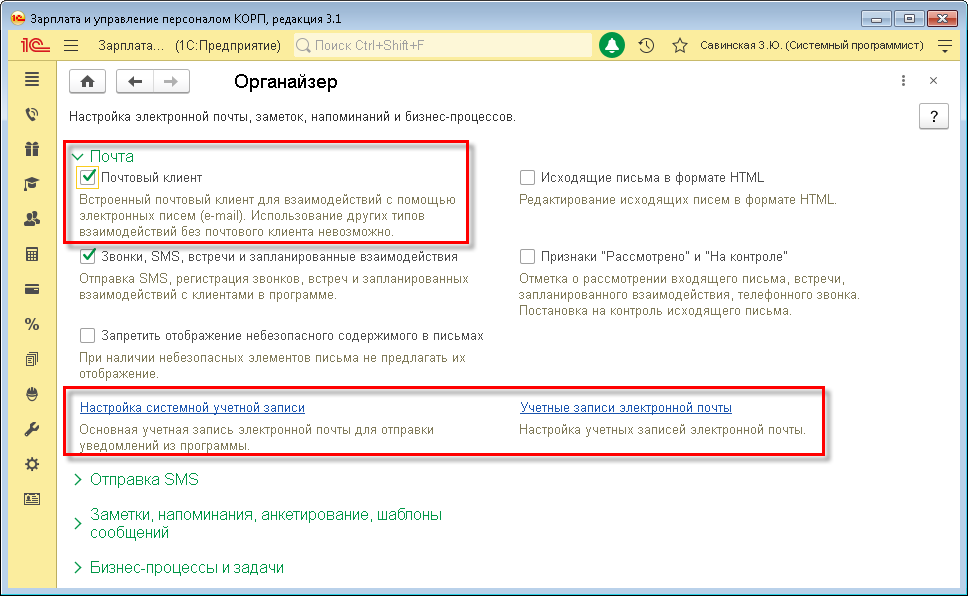 Чтобы воспользоваться этими возможностями 1С:ЗУП КОРП администратор в Администрирование/Органайзер включает использование в программе почтового клиента и прописывает системную учетную запись, а также персональные и групповые учетные записи.