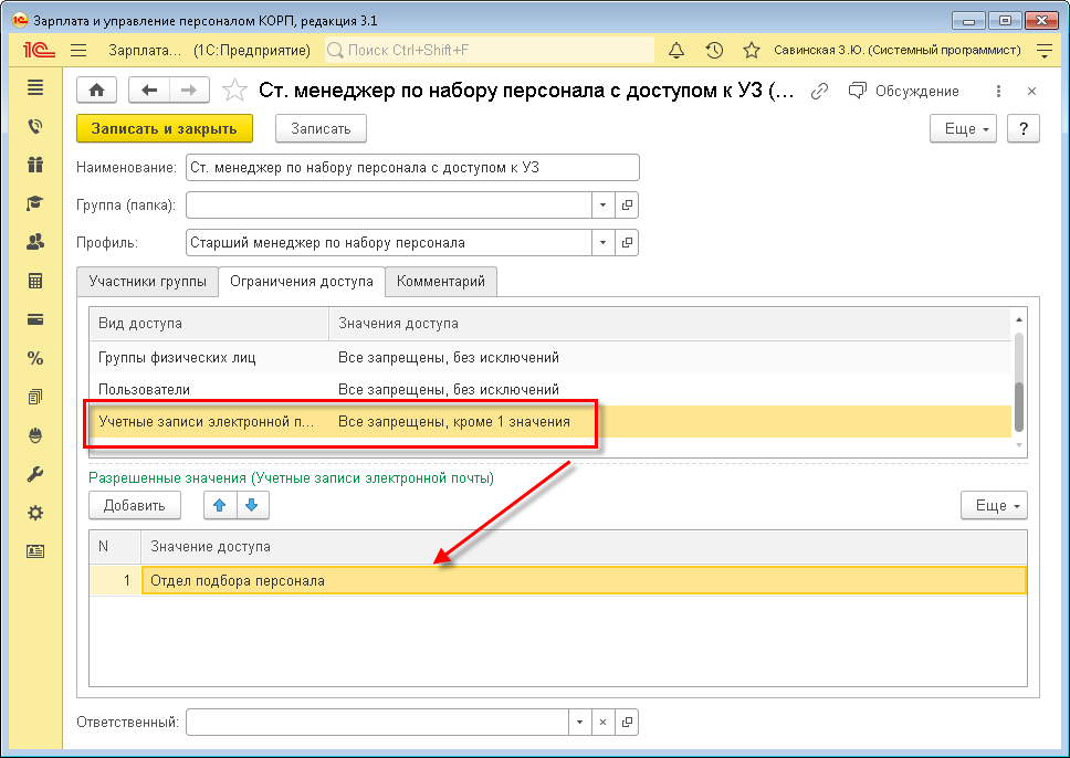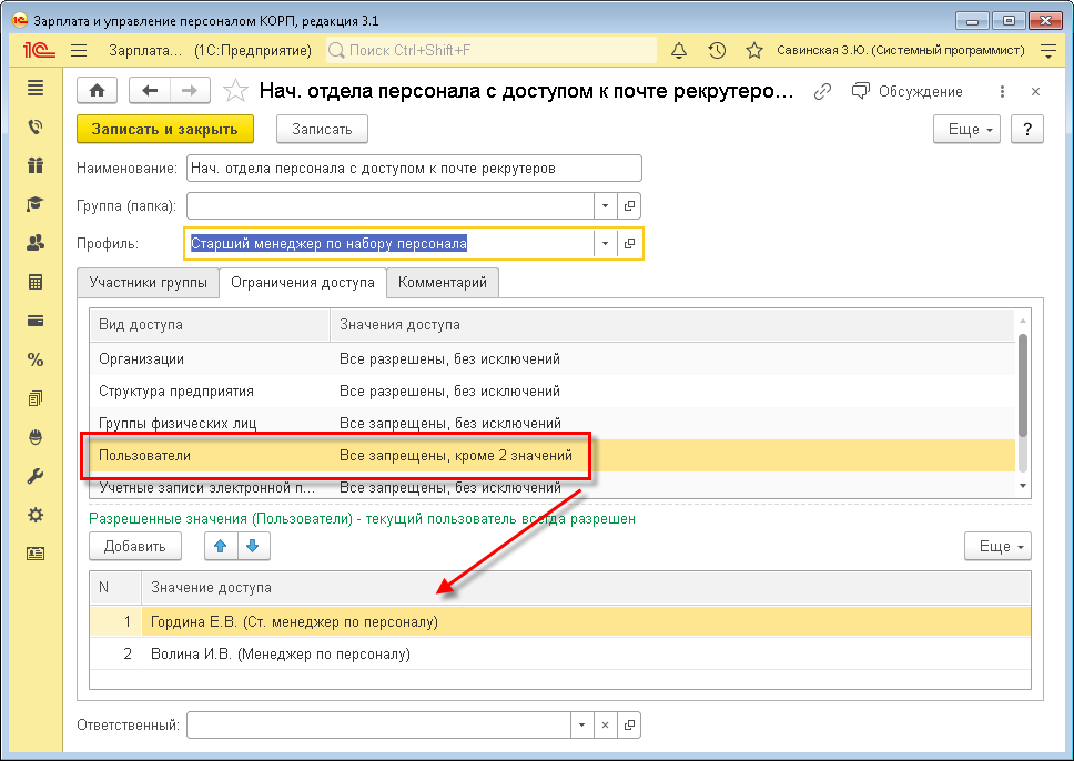 Чтобы руководителям отделов персонала дать доступ к персональным почтовым ящикам их подчиненных, следует включить руководителя в группу доступа для профиля «Менеджер по набору персонала» или «Старший менеджер по набору персонала» и перечислить для вида доступа «Пользователь» список подчиненных.