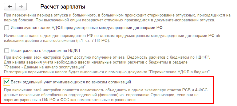 Для включения возможности предусмотрена новая настройка расчета зарплаты – "Вести отдельный учет отчитывающихся по взносам организаций".