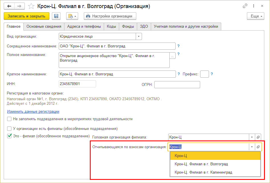 После её включения в карточке филиала появляется возможность указать, что за него отчитывается другая организация (головная или другой филиал).