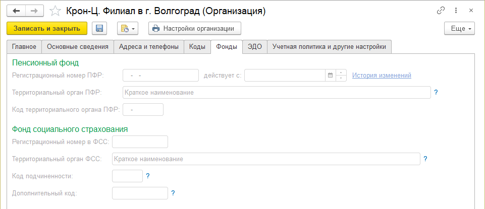 Для несамостоятельного филиала поля на закладке "Фонды" становятся недоступными.
