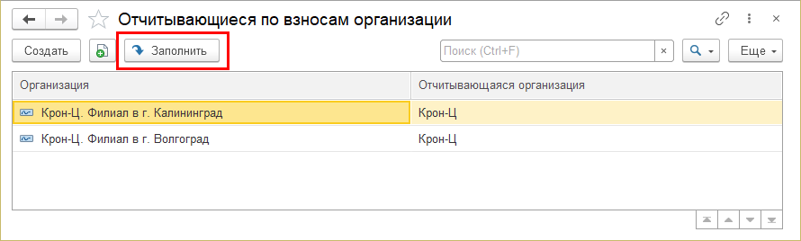 Для крупных организаций с большим числом филиалов, за которые отчитывается головная организация, реализован вспомогательный сервис массовой настройки. В списке регистра сведений "Отчитывающиеся по взносам организации" (открыть можно через "Все функции", "Функции для технического специалиста" или по прямой ссылке: e1cib/list/РегистрСведений.ОтчитывающиесяПоВзносамОрганизации) имеется кнопка "Заполнить", по который настройка заполняется одновременно для всех филиалов:
