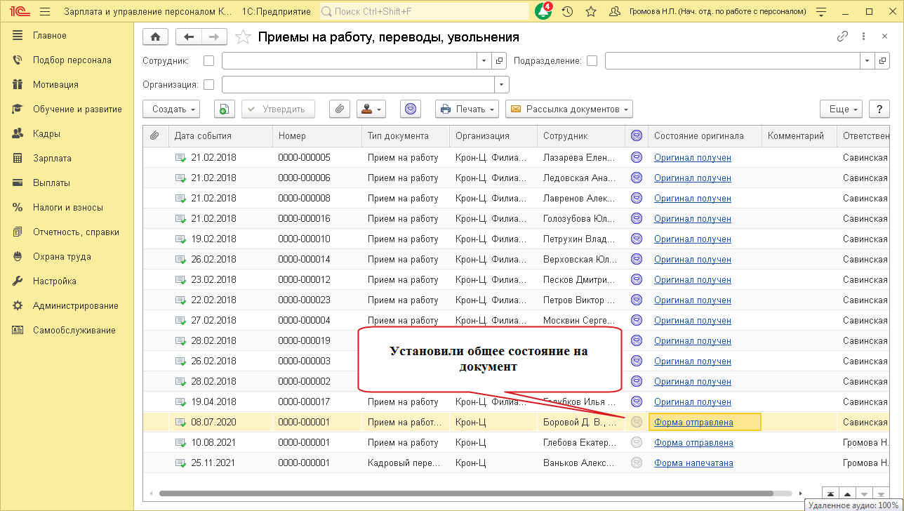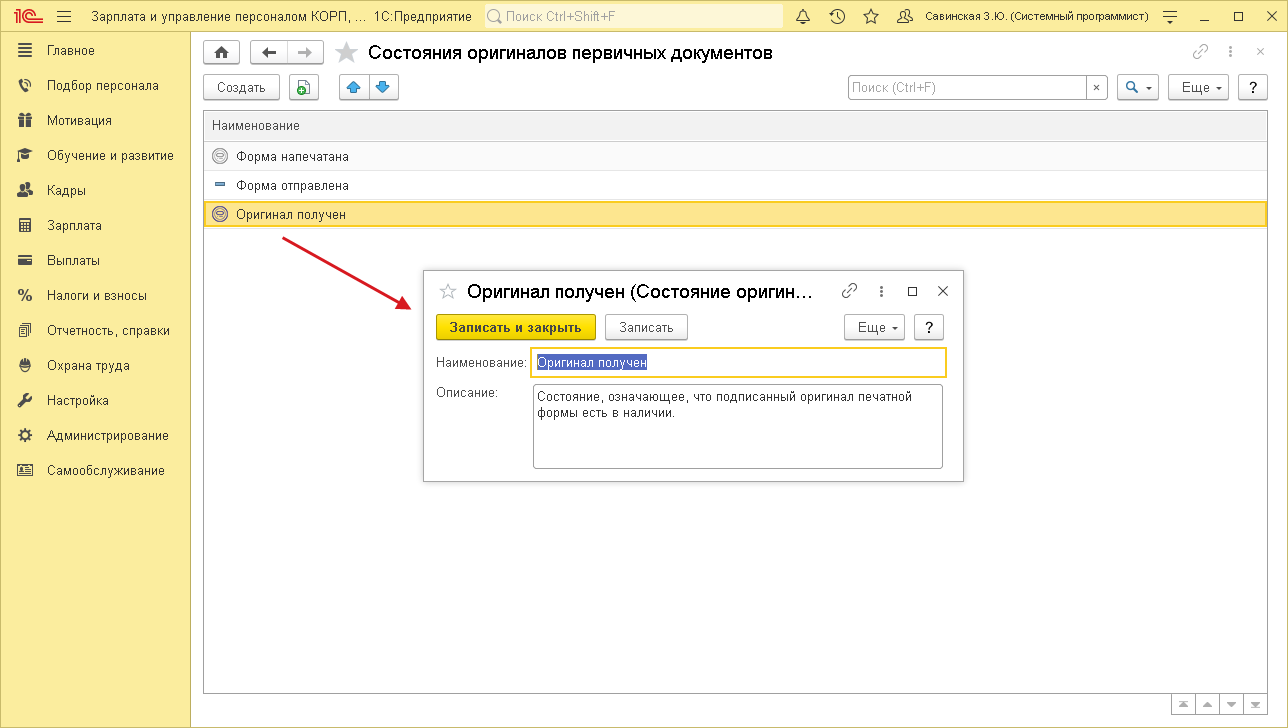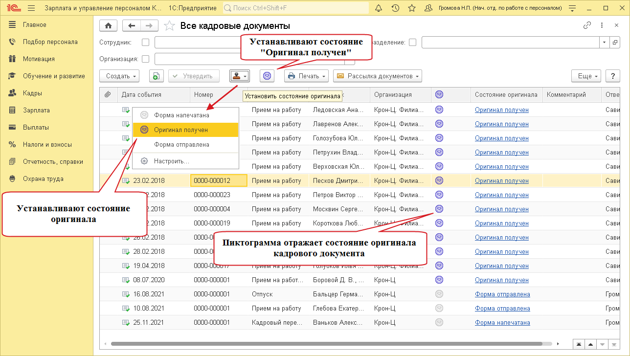Указать состояние оригинала можно вручную, а часть присваивается автоматически. Например, при печати кадровых приказов и рассылке их сотрудникам из 1С:ЗУП КОРП программа поставит состояние оригинала Форма напечатана и Форма отправлена соответственно.