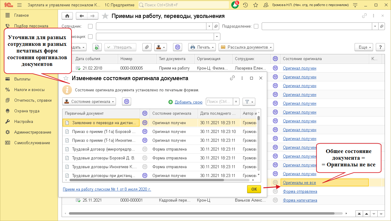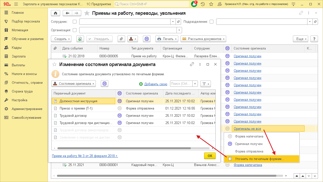 Если не всем печатным формам кадрового документа установлена отметка о получении оригинала, для такого документа в списке будет отображаться состояние Оригиналы не все.