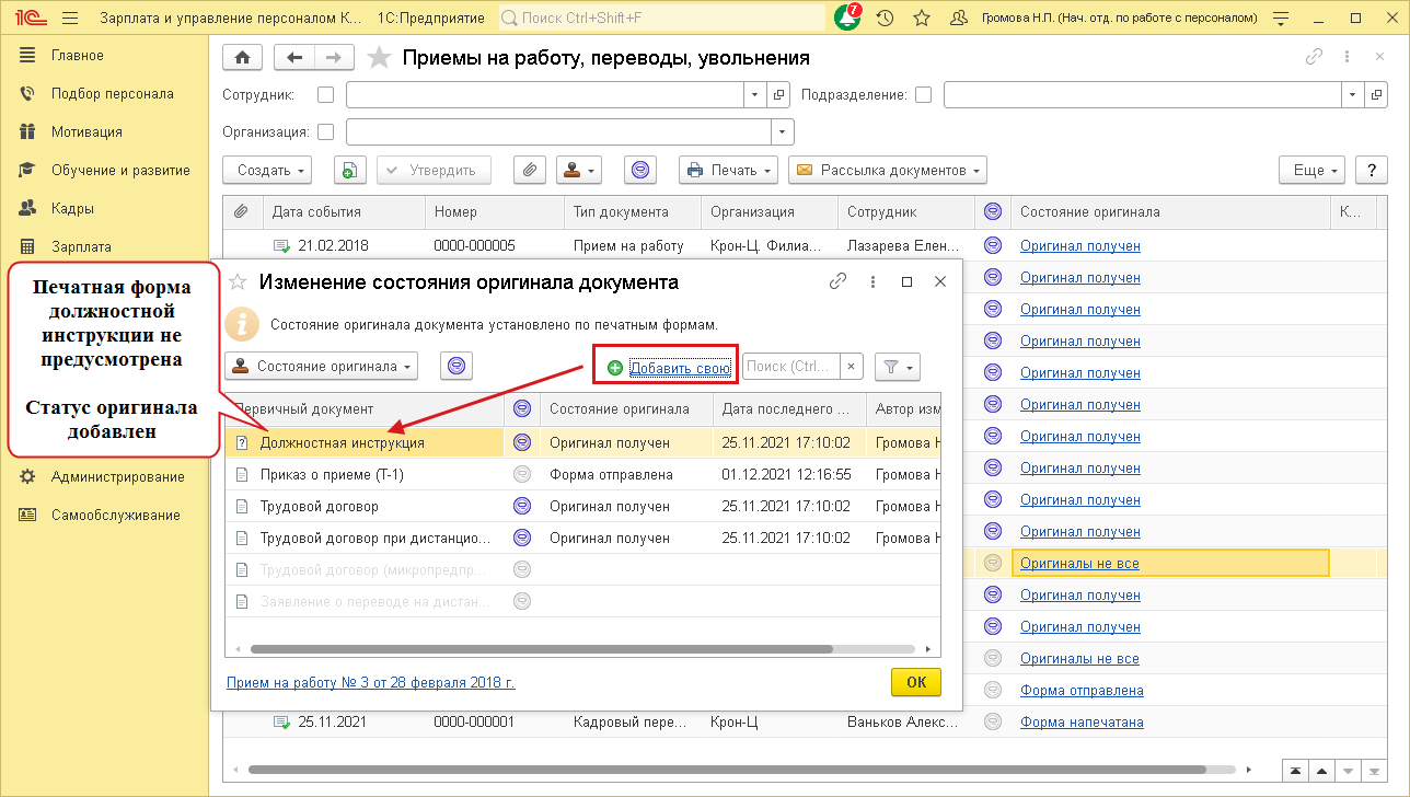 Бывает, что кадровые документы распечатывают не из 1С:ЗУП КОРП. Например, должностная инструкция может печататься из Microsoft Word, но контролировать отравление и получение документа необходимо. В этом случае добавляют наименование документа и отмечают его состояние.