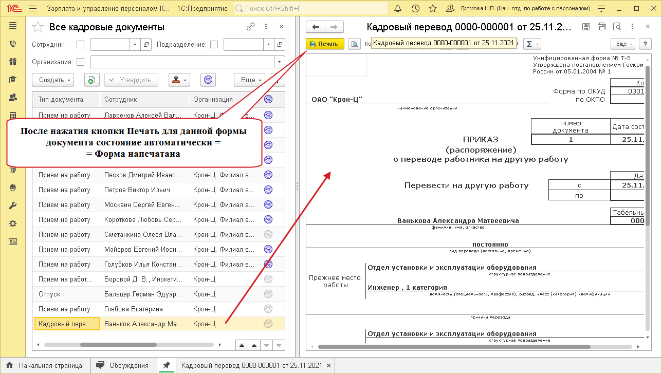 При печати документов в 1С:ЗУП КОРП состояние формы, отправленной на печать, автоматически изменяется на Форма напечатана.