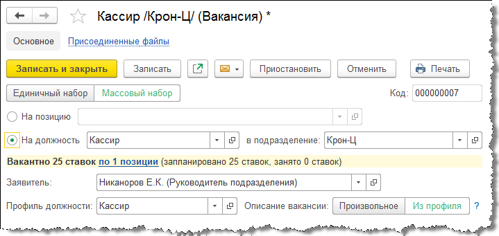 В рамках массового набора вакансия может быть также открыта на указанную должность без указания подразделения для рассмотрения на одну вакансию большого потока кандидатов, к которым предъявляются однотипные требования.