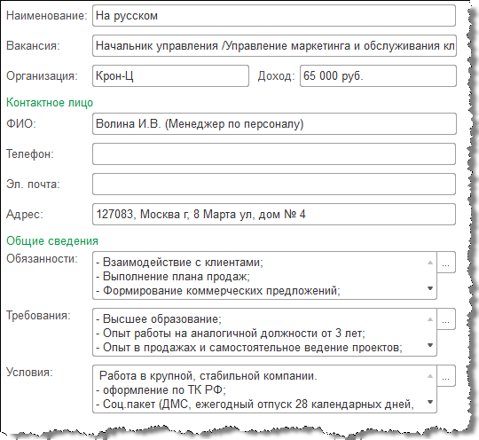 В версии 3.1.4 стало возможным отправлять ссылки на вакансию для ее просмотра, отправлять описание вакансии по электронной почте, а также добавлена печатная форма вакансии.