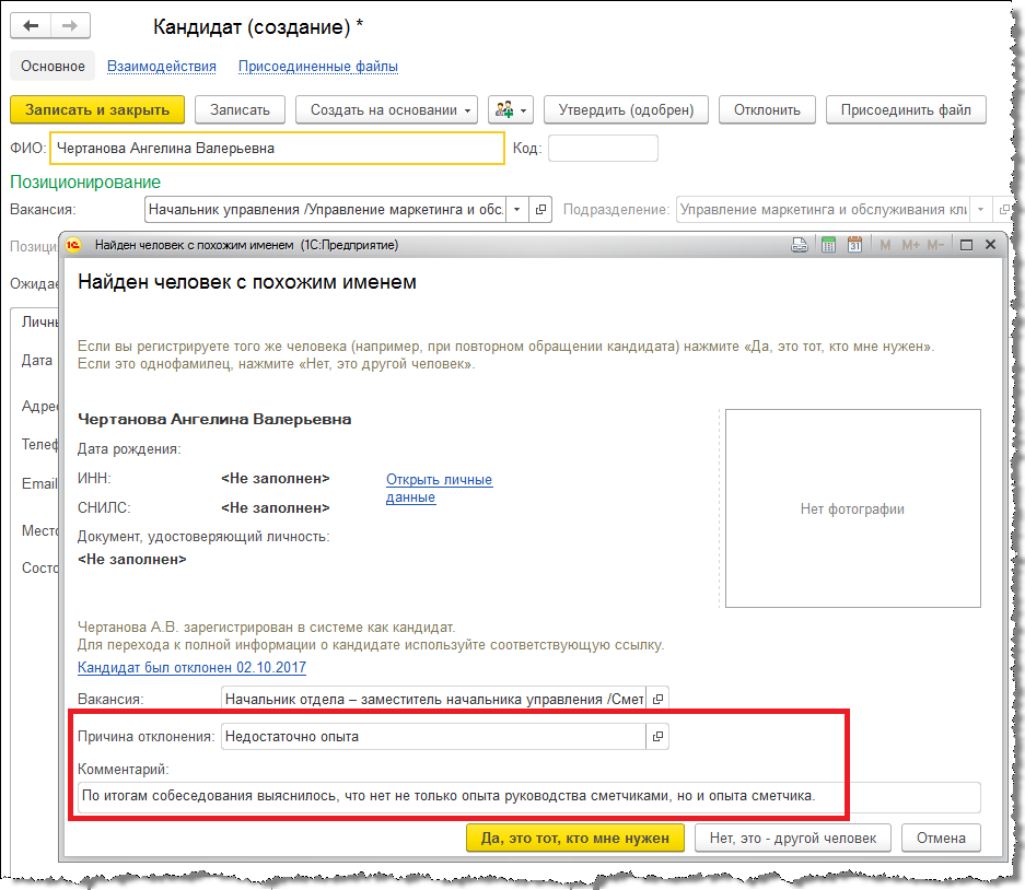 В дальнейшем при попытке создать нового кандидата такой комментарий также будет показан пользователю.