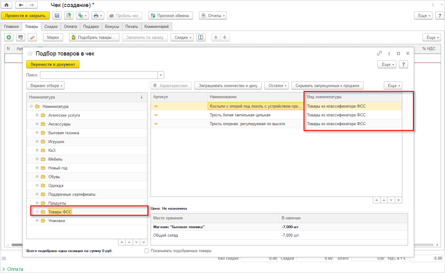 Для удобства подбора товары из классификатора ФСС были выделены в отдельную группу, а также был создан отдельный вид номенклатуры.