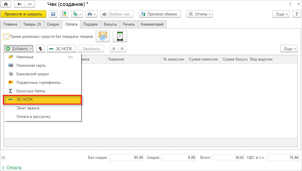 Первоначально необходимо настроить вид оплаты с типом оплаты Платежная система, указав платежную систему - Электронные сертификаты НСПК. Следом потребуется создать вид оплаты с типом оплаты Платежная карта, указав ту же платежную систему - Электронные сертификаты НСПК. Таким образом, будет связан один вид оплаты с другим, оплата картой и оплата сертификатом.