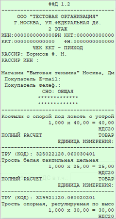 Для каждого из товаров печатается код ТРУ и сводная информация об оплате.