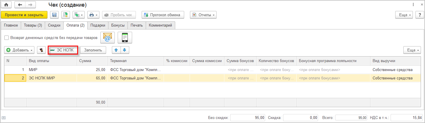 Также при фискализации фиксируется код оплаты платежной системой (Basket ID) в регистре Фискальные операции. После успешной фискализации чека информация о подтверждении операции автоматически передается в НСПК. Успешная передача или ошибка при передаче фиксируется в журнале регистрации с привязкой к текущему Чеку.