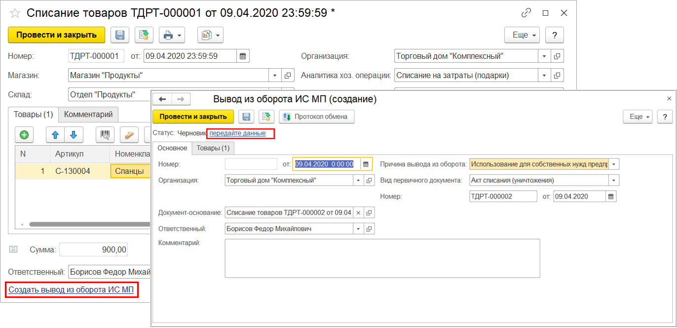 Причина вывода из оборота примет значение Использование для собственных нужд предприятия, а Вид первичного документа - Акт списания (уничтожения). Далее необходимо передать данные в ИС МП с помощью одноименной ссылки.