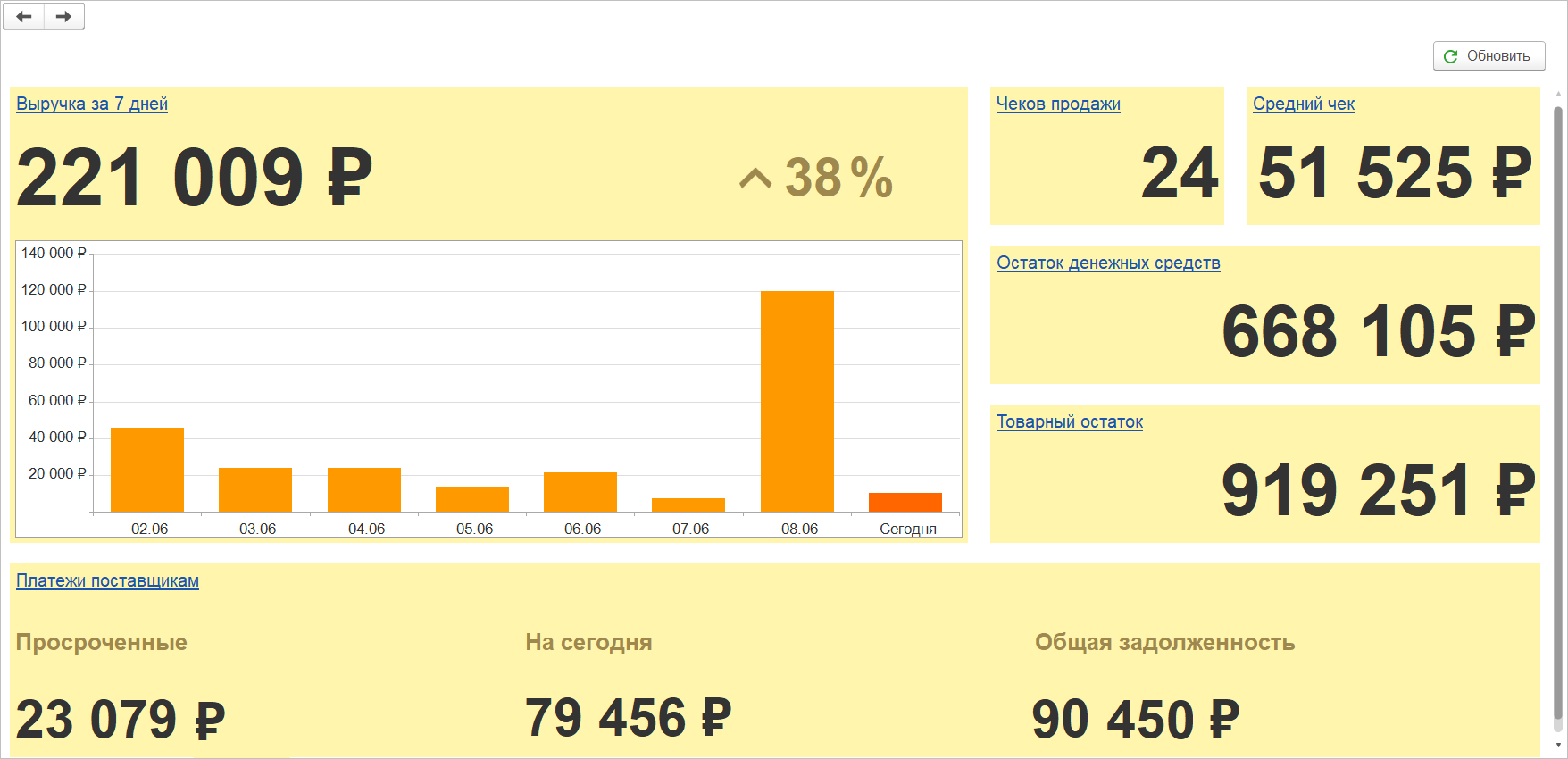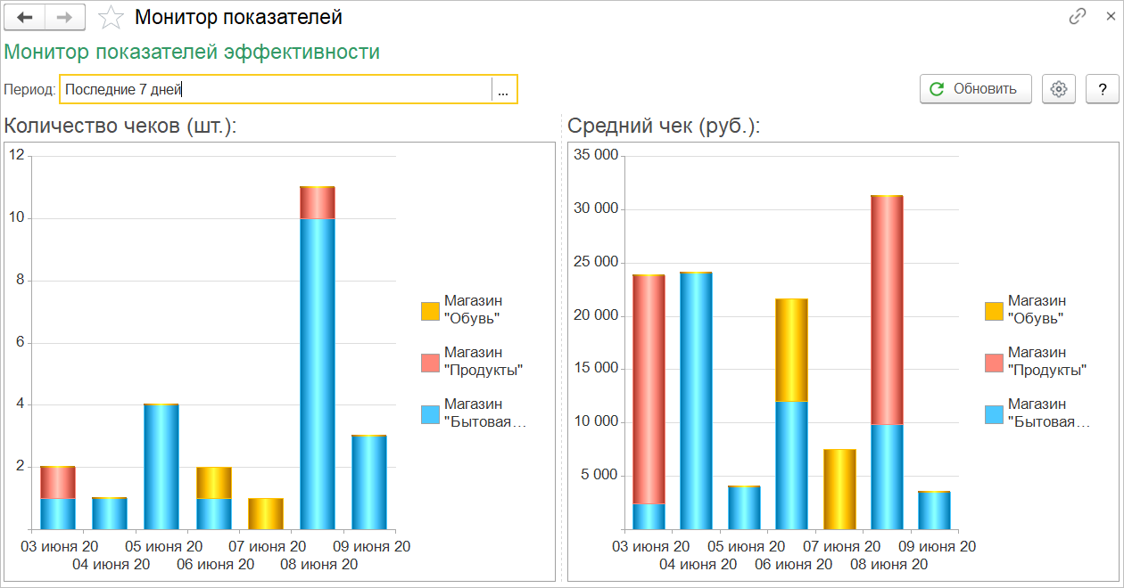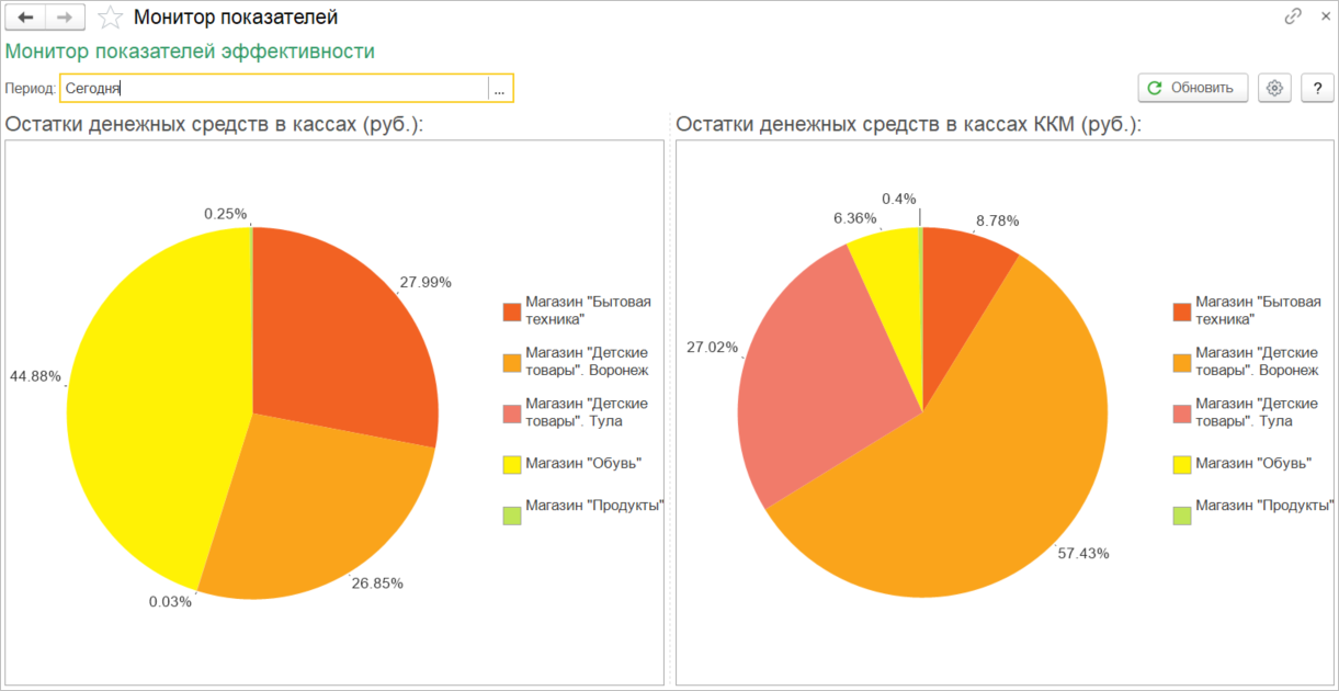 Директору магазина больше не придется разбираться в настройках отчетов или обращаться к помощникам, чтобы получить первостепенную информацию по показателям магазина. При старте программы «1С:Розница» будет открыта начальная страница с монитором директора. Данный инструмент позволит оперативно и наглядно оценить основные показатели деятельности розничного предприятия в динамике.
