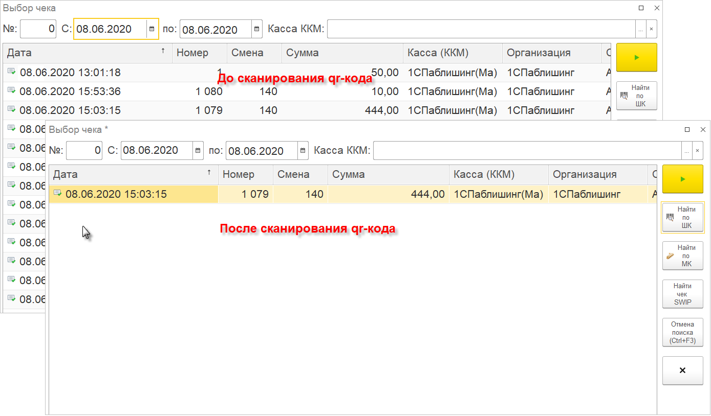 Теперь в списке «Чеков ККМ» можно легко найти конкретный документ - по его qr-коду. Например, при оформлении возврата от покупателя в списке чеков продажи можно считать сканером предоставленный покупателем qr-код и программа автоматически установит отбор по данному документу.
