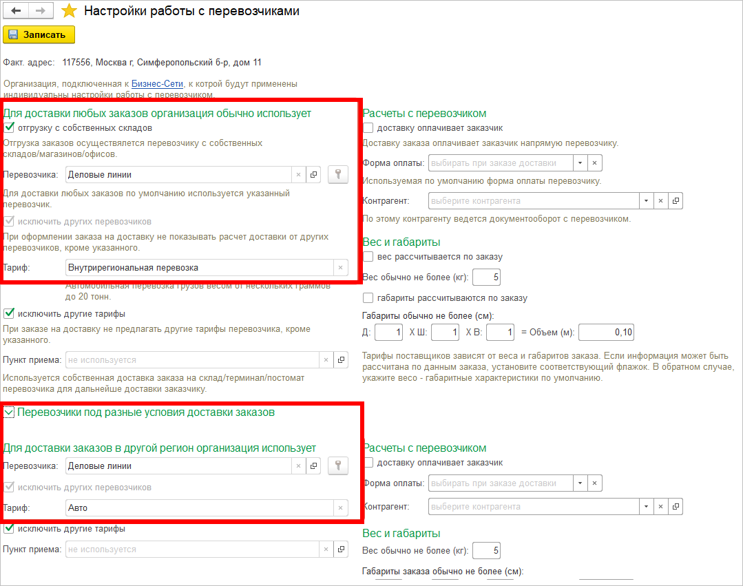 Чтобы ускорить и упростить работу пользователя, избежать многоразовый ввод однотипных параметров при оформлении каждого заказа на доставку в «1С:Розницу» добавлена возможность использования шаблона параметров работы с перевозчиками.