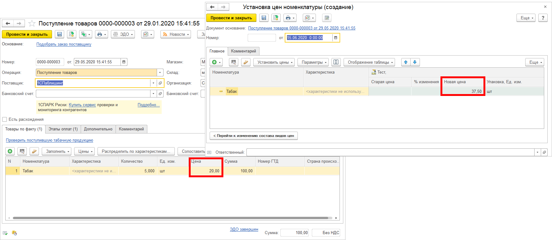 Реализован контроль максимальной розничной цены на табачную продукцию. При создании документа Установка цен номенклатуры на основании Поступления товаров, в котором имеются коды маркировки, цена на табачную продукцию будет устанавливаться в соответствии с МРЦ.