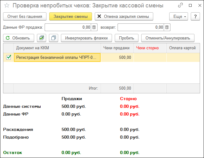 Статус соответствующего документа Регистрация безналичной оплаты примет значение Чек пробит, а в регистре Фискальные операции появится запись о данной операции.