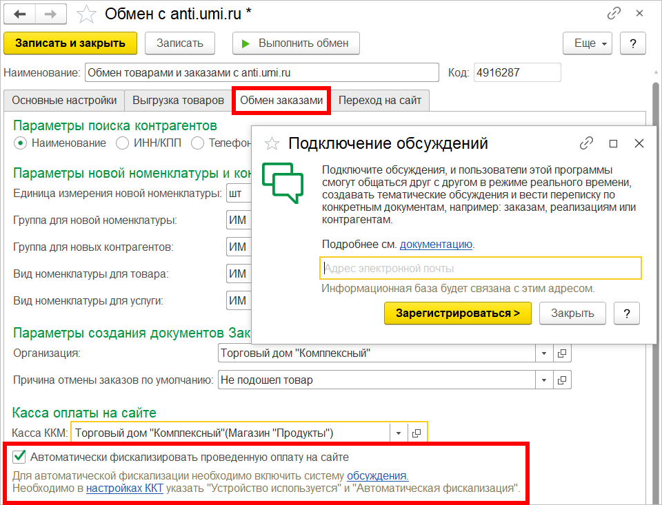 С новой функцией удаленной фискализации чеков у пользователей появилась возможность сэкономить на услугах облачных касс. При загрузке безналичной предоплаты по заказу с сайта Чек ККМ будет автоматически пробит на кассе магазина. Для этого необходимо в настройке обмена с сайтом установить флажок Автоматически фискализировать проведенную оплату на сайте и далее следовать подсказкам системы.