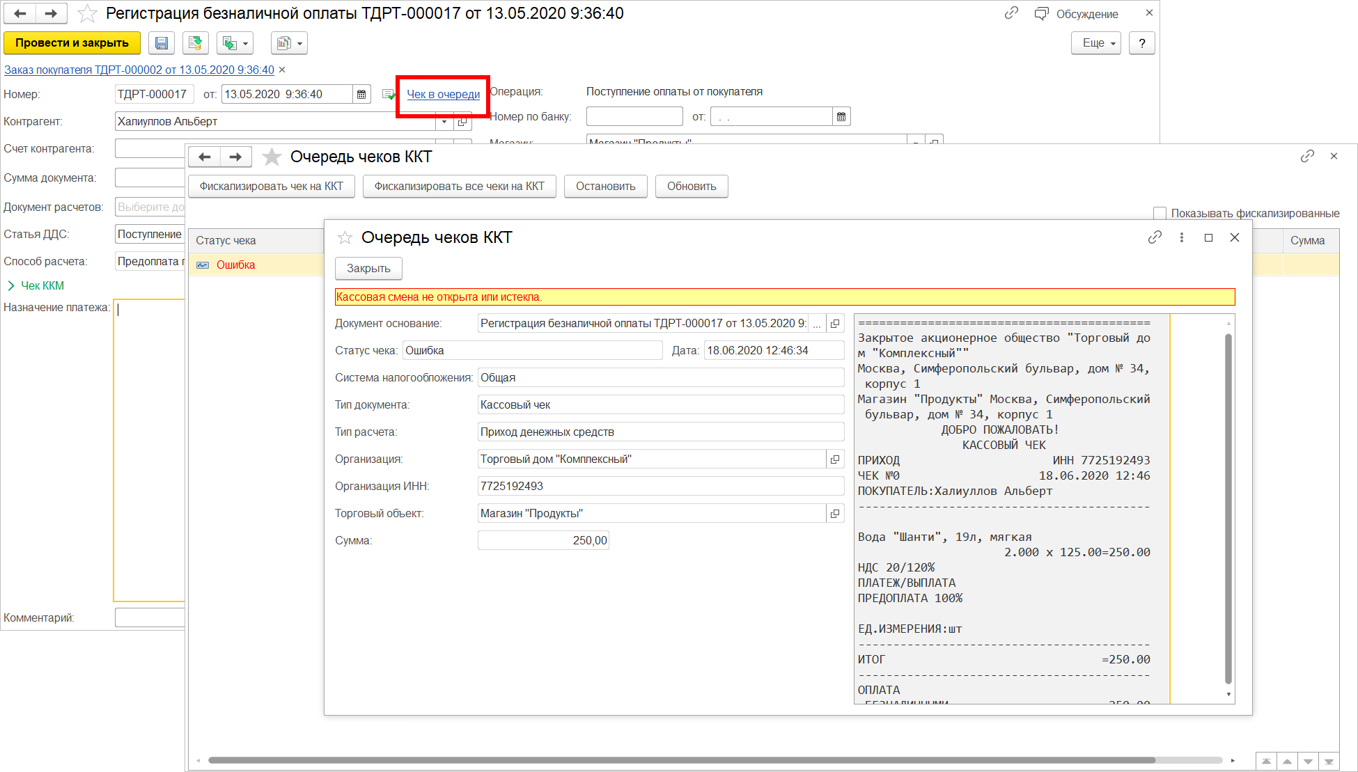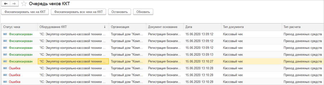 Если при фискализации чека возникла ошибка, то статус соответствующего документа Регистрация безналичной оплаты примет значение Чек в очереди. При нажатии на статус откроется Очередь чеков ККТ с ошибкой. Например, фискализация может не пройти, если кассовая смена не была открыта.