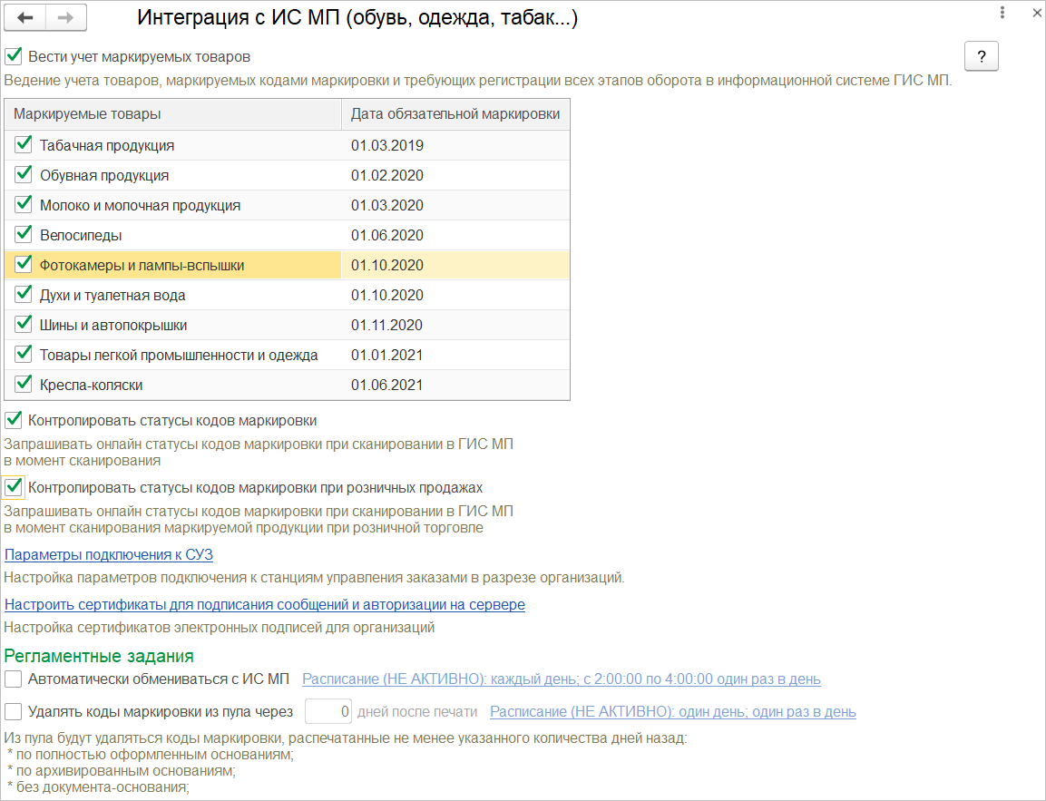 Для данных категорий товаров поддержан обмен с государственной информационной системой ГИС МП («Честный знак»). Используемые в магазине категории товаров нужно отменить на специальной форме флажками. Справа будет отображена дата, с которой маркировка для данной категории будет обязательна.