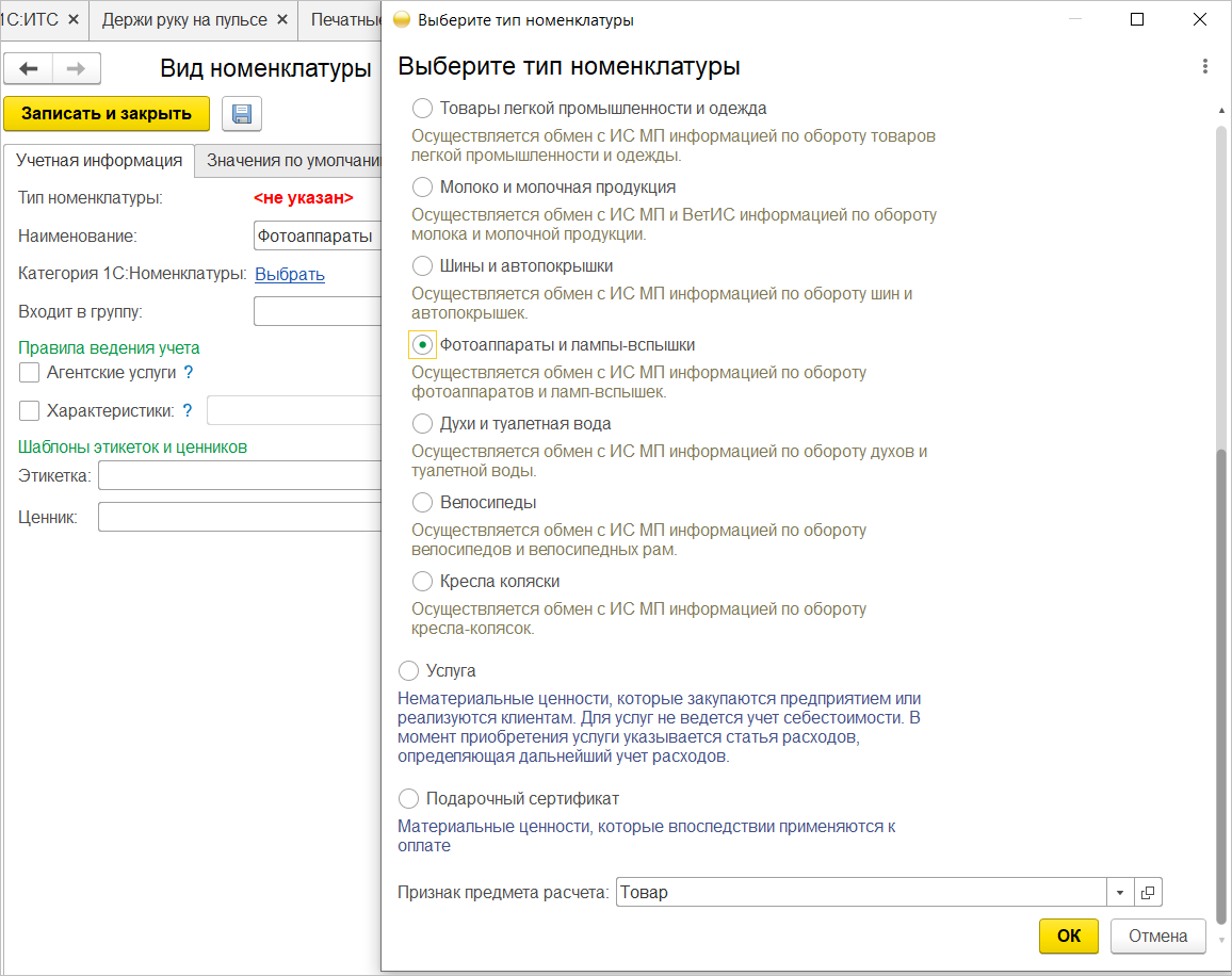 Для использования конкретной категории нужно в соответствующем Виде номенклатуры указать один из семи новых Типов номенклатуры. Рекомендуется править существующие карточки видов номенклатуры и номенклатуры, а не создавать новые для маркируемых товаров.