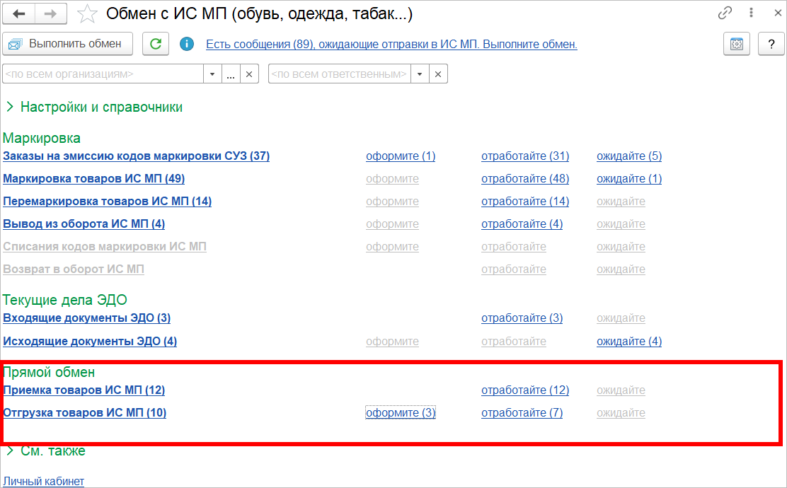 Данные документы отражаются в новом разделе Прямой обмен рабочего места Обмен с ИС МП (обувь, одежда, табак...). Здесь можно оформлять и контролировать все операции по всем категориям маркируемой продукции.