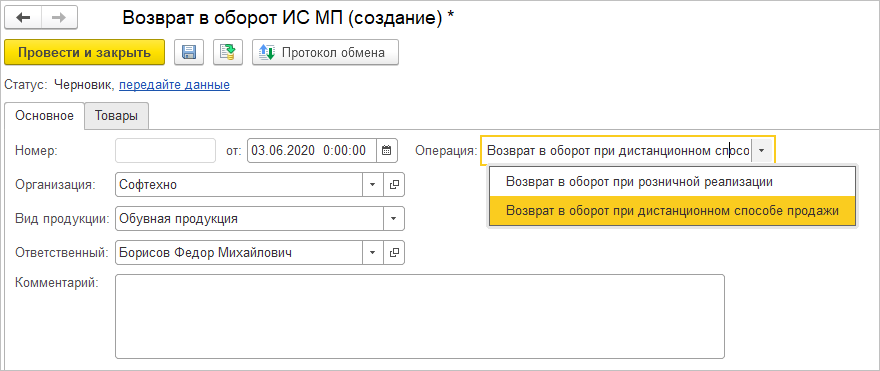 При дистанционной торговле возникают ситуации, когда отсутствует возможность передать в ИС МП через ОФД информацию о возврате маркируемой продукции, которая продажей была выведена из оборота. Для отражения таких возвратов предназначен документ Возврат в оборот ИС МП.