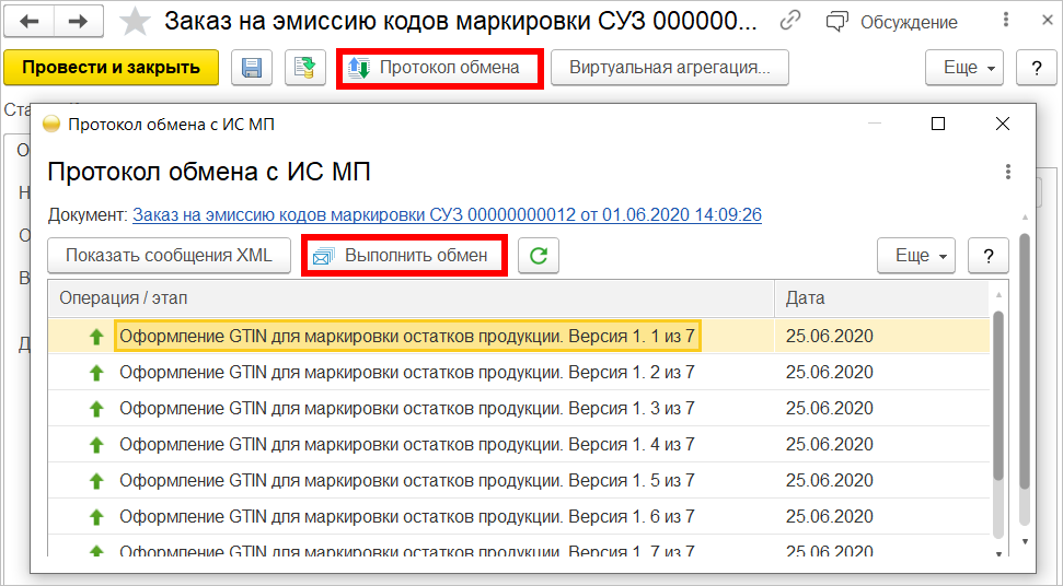 Если во время обмена данными с ИС МП произошел обрыв связи или аварийное завершение программы, в результате чего не были получены все коды маркировки (статус документа отличается от значения Коды маркировки эмитированы), то пользователь имеет возможность повторно выполнить обмен данными с ИСМП. Для этого нужно из формы документа с помощью одноименной кнопки прейти в форму Протокол обмена и нажать кнопку Выполнить обмен.