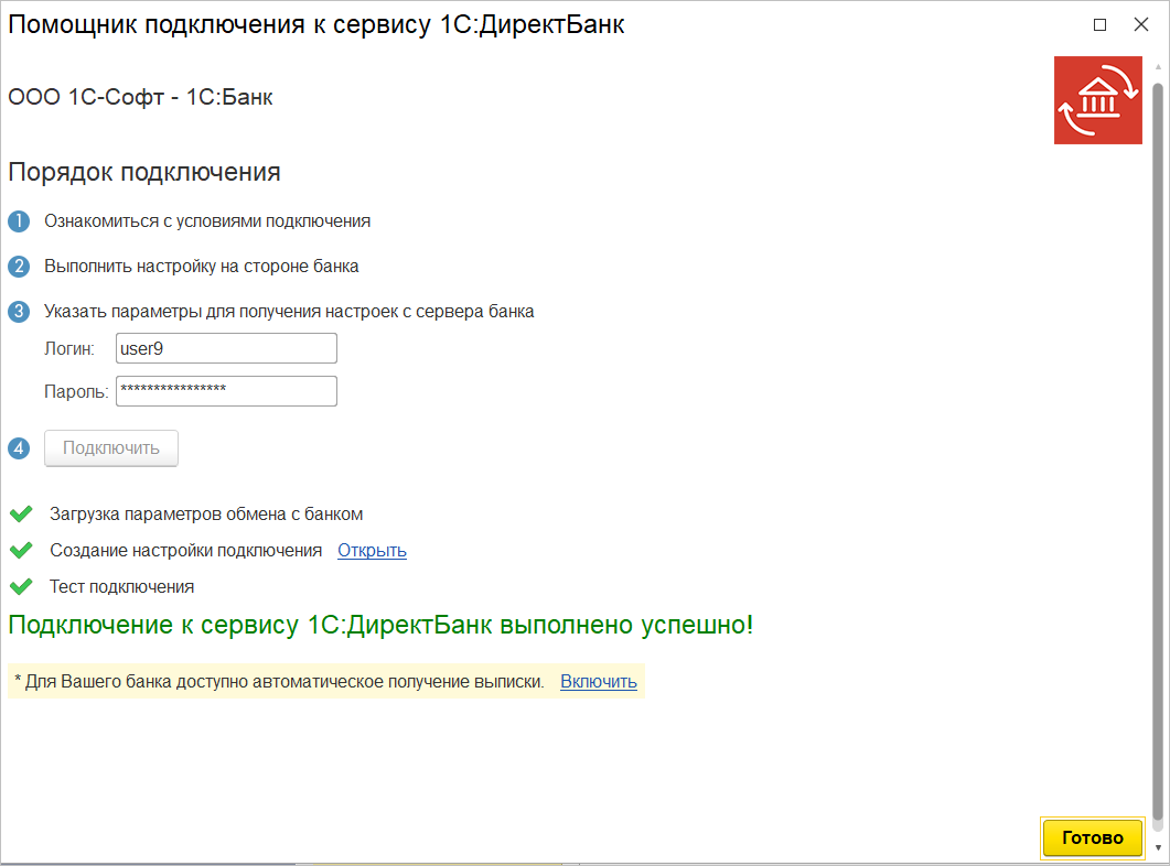 Специальный Помощник подключения к сервису 1С:ДиректБанк упростит процедуру подключения.